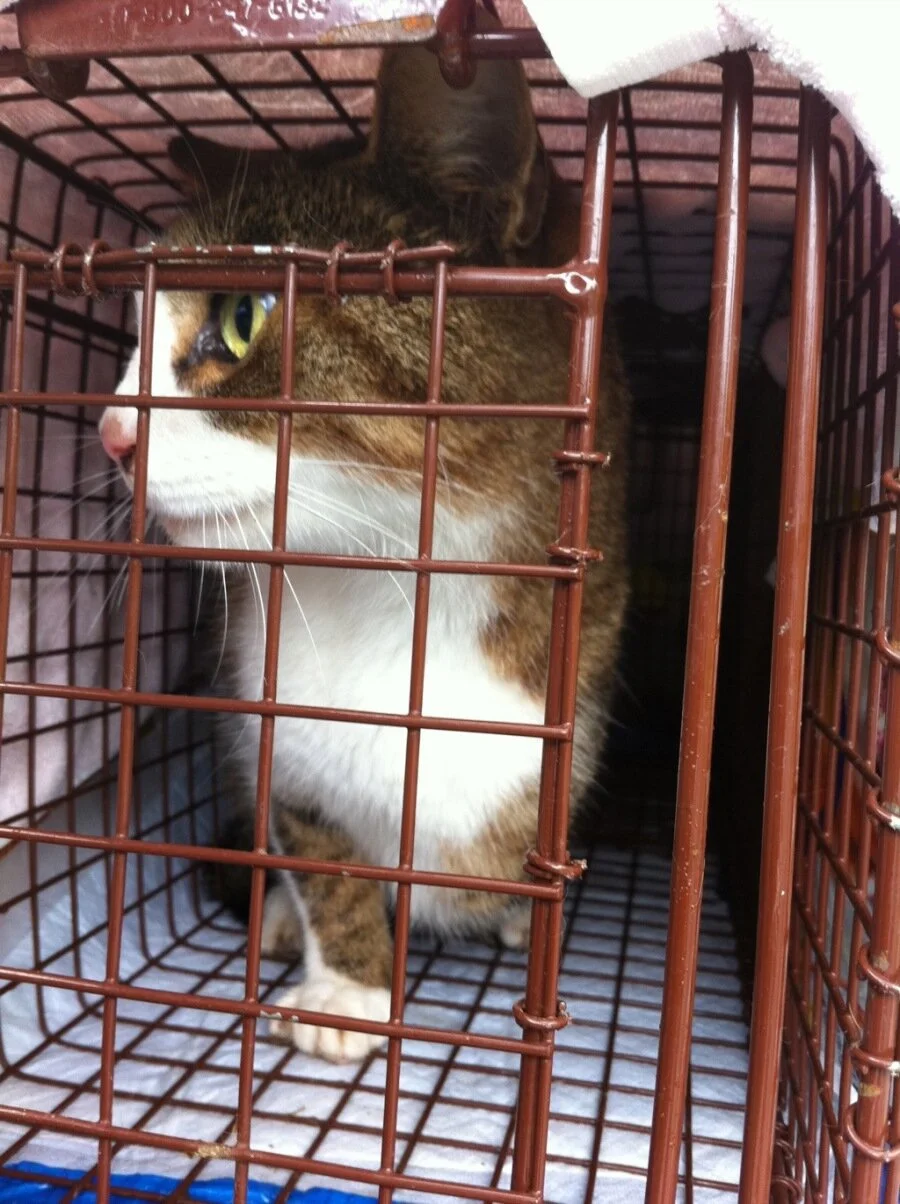 We continued on for several stations, and then came to the station that a cat missing her front leg had been seen at recently. It’s hard enough for kitties that are strong to survive under these tough conditions, however for those with disabilities, the challenge becomes even greater. We are so glad to see her waiting outside the feeding bin, along with another calico. When we trap her, the calico waits off to the side, soaking wet. We have that moment of wondering what to do. There is only one empty cage remaining at the shelter, given the two that we have already trapped. But there she is waiting patiently for the only food that she will likely get over the next days, despite the cold rain, and we are just too heartbroken to leave her behind. So, she comes along too, back to the shelter.